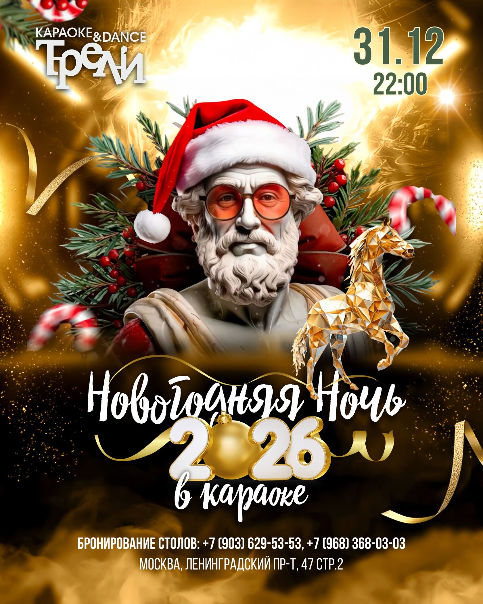 ✨ Встречаем Новый 2026 год в караоке ТРЕЛИ! 🎤 Караоке до утра, танцы и шампанское рекой 🎁 Шоу-программа, фотозона, подарки и незабываемая атмосфера праздника! 📅 31 декабря | начало в 22:00 🎟 Бронь столов открыта — количество мест ограничено!
